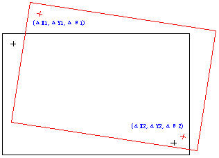 在材料無任何旋轉(zhuǎn)以及偏移的情況下,兩個(gè)MARK點(diǎn)的理論坐標(biāo)為X1,Y1與X2,Y2。在實(shí)際上料以后,相機(jī)拍攝后會獲取實(shí)際的坐標(biāo)X3,Y3和X4,Y4。由此就可得: