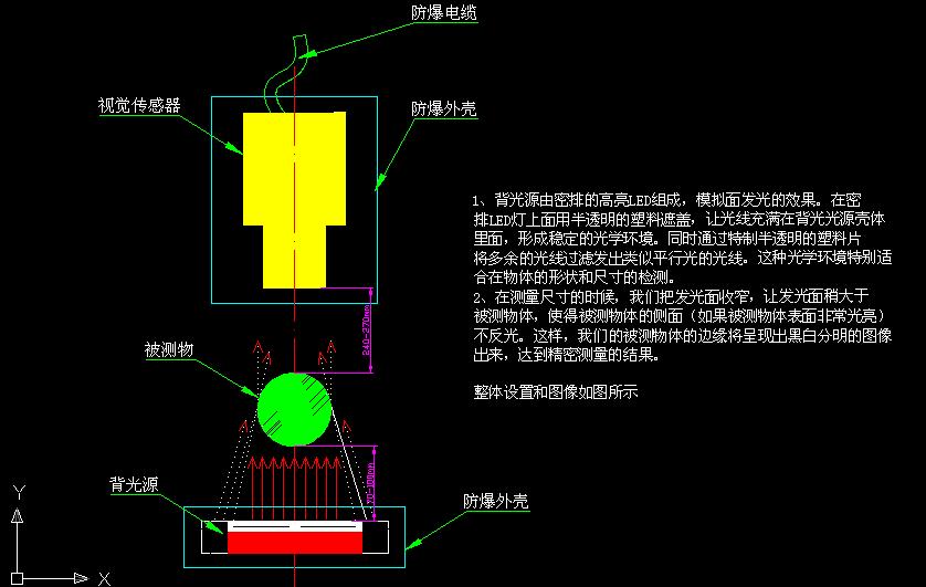 在視覺(jué)傳感器外邊加一個(gè)密封防爆箱,防爆箱有一面選用同光率良好的防爆玻璃并使其與視覺(jué)傳感器的鏡頭一面緊貼,這樣既可以保證現(xiàn)場(chǎng)環(huán)境的防爆要求有可以確保視覺(jué)系統(tǒng)的拍照精度。
