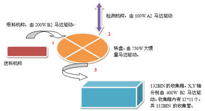 送料機構把料送到固定位→吸料機構把料送到轉盤上的工位1→轉盤轉動一個角度把料送到工位2→檢測機構下來工作采集相關數(shù)據(jù)→轉盤再把檢測后的料送到工位3→高壓氣槍把料吹入收集箱(收集箱會根據(jù)檢測的結果,事先確定好收集管的位置)。