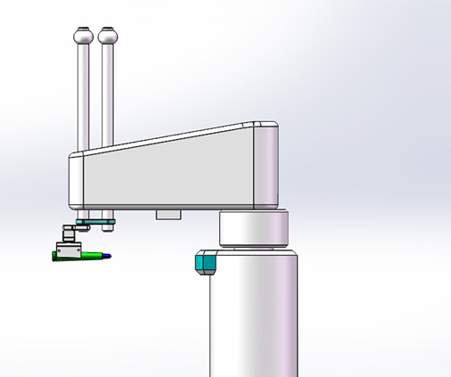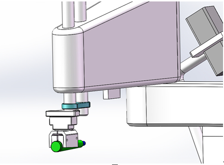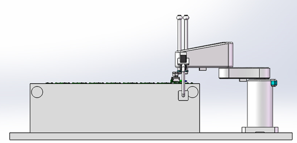 Scara平面關(guān)節(jié)機(jī)器人負(fù)責(zé)搬運(yùn)和動(dòng)作的實(shí)施,落實(shí)槍械子彈的姿態(tài)糾正和從來料輸送鏈抓取子彈并將糾正姿態(tài)后的子彈運(yùn)送和碼垛到彈夾上。
