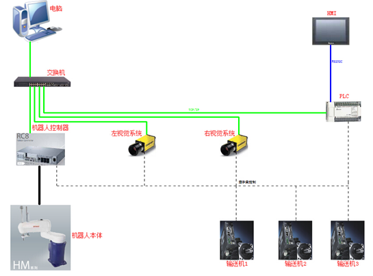 如上圖所示,機(jī)器人控制器,2臺(tái)視覺系統(tǒng),PLC全部進(jìn)交換機(jī)。如果,有需要交換機(jī)可以進(jìn)PC,采集和控制機(jī)器人、視覺系統(tǒng)、PLC。同時(shí),在本地PLC與HMI通訊。終上即可以實(shí)現(xiàn)本地控制,也可以實(shí)現(xiàn)遠(yuǎn)程控制與監(jiān)控。
