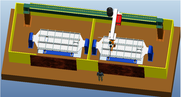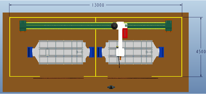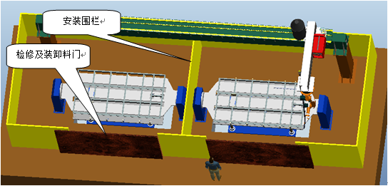將所有運(yùn)動(dòng)設(shè)計(jì)布置與圍欄內(nèi),可以為工人及其他相關(guān)人員提供一個(gè)安全可靠的工作環(huán)境。圍欄布置有檢修和人工上料門,布置必要的檢測(cè)開關(guān),并與整套控制系統(tǒng)聯(lián)動(dòng),在設(shè)備正常工作時(shí),假如有人員闖入,將立即停止所有設(shè)備的運(yùn)轉(zhuǎn),確保人員安全。其分為兩個(gè)獨(dú)立部分,集體結(jié)構(gòu)見下圖。這樣可以將兩個(gè)工位分成獨(dú)立的兩個(gè)工作空間,使得人工裝卸料和焊接分開獨(dú)立運(yùn)行,互不影響。