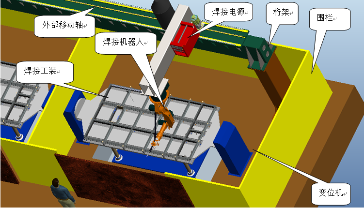 此系統(tǒng)為實(shí)現(xiàn)機(jī)架的自動(dòng)化焊接而特別設(shè)計(jì)的。本系統(tǒng)選用一臺(tái)六軸工業(yè)機(jī)器人及配套的焊接電源、焊槍、送絲機(jī)等;自行設(shè)計(jì)機(jī)器人外部移動(dòng)軸、變位機(jī)、焊接工裝及配套安全防護(hù)系統(tǒng);配套專業(yè)焊接控制系統(tǒng)和智能界面,采用人工上下工件,完成工件從夾緊——散件點(diǎn)定——焊縫滿焊的自動(dòng)化焊接。