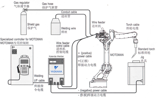 ? 系統(tǒng)組成:6軸關(guān)節(jié)機(jī)器人、焊接電源、焊槍、送絲機(jī)等。配備電弧跟蹤系統(tǒng)、機(jī)器人弧焊、起始點(diǎn)跟蹤、多層多道焊接系統(tǒng)。