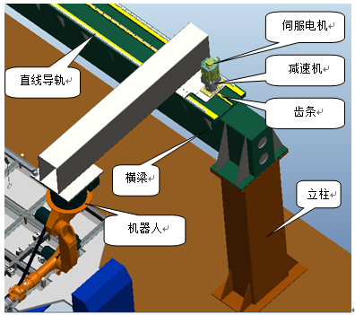 外部移動(dòng)軸為機(jī)器行走機(jī)構(gòu),實(shí)現(xiàn)不同工位弧焊機(jī)器人的位置變換、同時(shí)在長(zhǎng)度方向上適應(yīng)工件的焊接范圍。此機(jī)構(gòu)采用伺服電機(jī)驅(qū)動(dòng),齒輪齒條傳動(dòng),直線導(dǎo)軌導(dǎo)向,機(jī)架采用桁架結(jié)構(gòu),其采用型鋼焊接,分段制造、整體組裝。具體結(jié)構(gòu)見下圖。