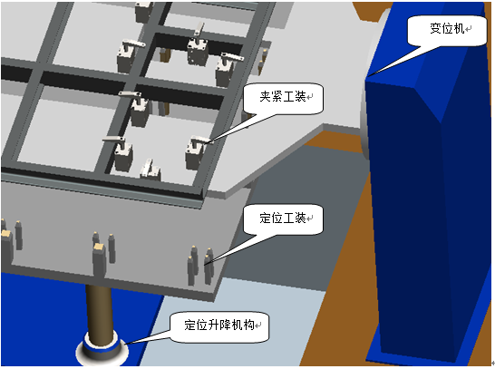 ? 第二:定位升降機(jī)構(gòu)將安裝其上的定位工裝頂升至夾緊工裝下部,并貼靠夾緊工裝,使定位工裝、夾緊工裝成為一個(gè)整體。