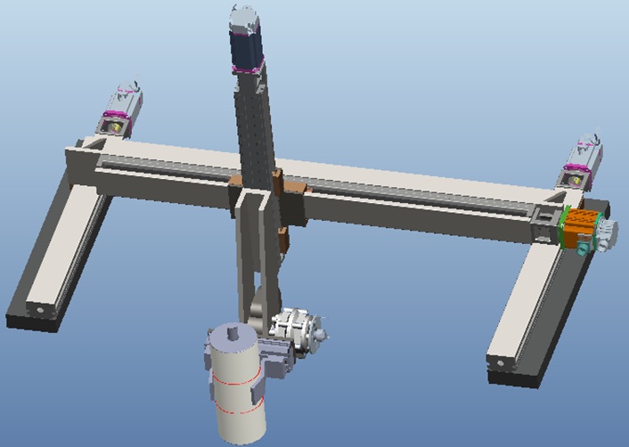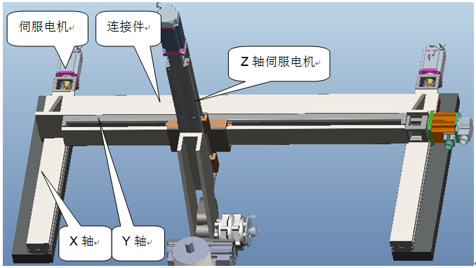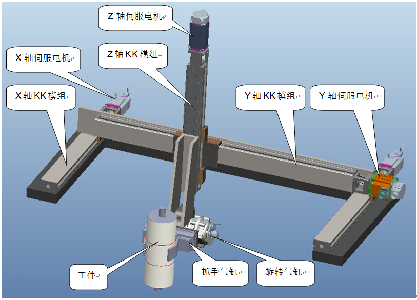 XYZ三軸均采用上銀模組搭建,配臺達(dá)伺服電機(jī)驅(qū)動。其主要功能是:三軸協(xié)調(diào)運(yùn)動,將需滅弧檢測的工件在輸送線、滅弧檢測設(shè)備之間來回精確搬運(yùn)。具體結(jié)構(gòu)示意圖如下: