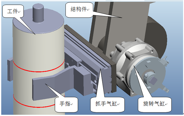 ? 機(jī)械手采用進(jìn)口抓手氣缸和旋轉(zhuǎn)氣缸并輔以結(jié)構(gòu)件實現(xiàn)滅弧檢測工件抓取和翻轉(zhuǎn)工作。具體機(jī)構(gòu)示意圖如下: