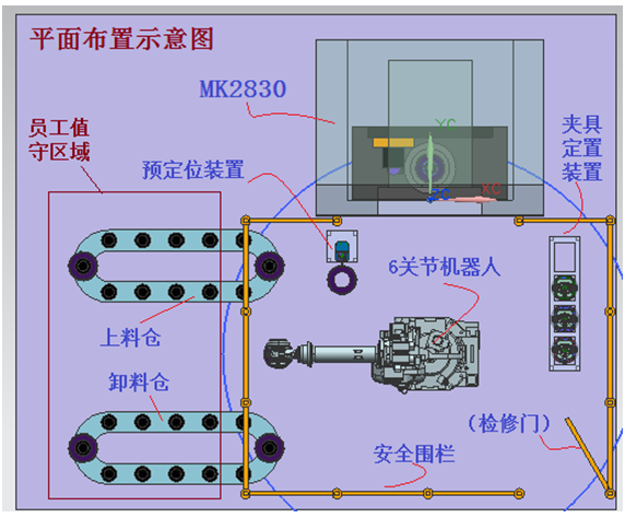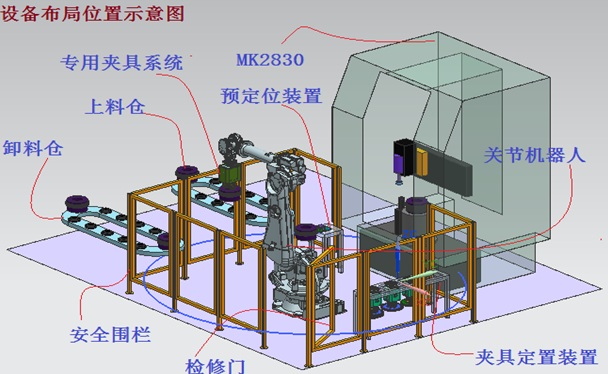 該系統(tǒng)自動上下料系統(tǒng)為MK2830磨床服務(wù),由1臺6軸110KG機器人(機器人系統(tǒng))、上料倉、卸料倉、專用夾具系統(tǒng)、預(yù)定位裝置、安全防護(hù)系統(tǒng)和電器控制(本方案中未作示意)系統(tǒng)等組成。