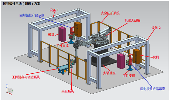 該方案屬于客戶生產(chǎn)線的技術(shù)改造方案,以提高作業(yè)效率、降低工人勞動(dòng)強(qiáng)度、預(yù)防作業(yè)安全為基本目的。整個(gè)系統(tǒng)包括:機(jī)器人系統(tǒng)、夾具系統(tǒng)、安全防護(hù)系統(tǒng)、工件暫存與轉(zhuǎn)運(yùn)系統(tǒng)、電器控制系統(tǒng)及安裝基座等構(gòu)成。