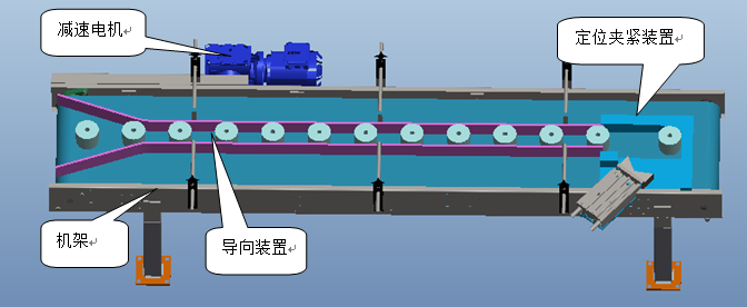 ? 其主要由機(jī)架、減速電機(jī)、輸送帶、導(dǎo)向裝置、定位夾緊裝置構(gòu)成。