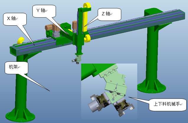 ? 其主要由機(jī)架、X軸、Y軸、Z軸、上下料機(jī)械手構(gòu)成。其示意圖如下: