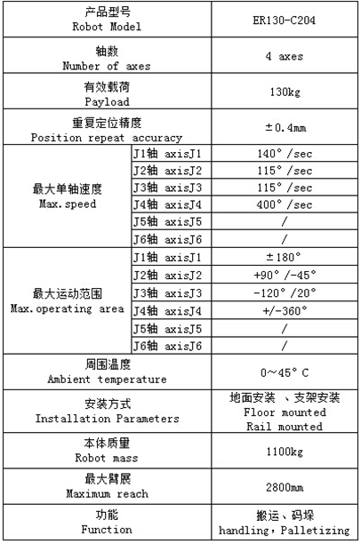 ER130-C204型四軸碼垛機(jī)器人末端負(fù)載能力為130kg,重復(fù)定位精度達(dá)到±0.4mm,具有高速碼垛搬運(yùn)功能,高速,穩(wěn)定,適用于碼垛、拆垛等場(chǎng)合。