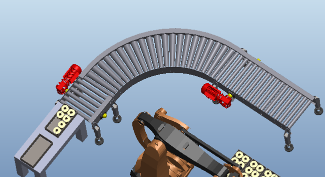 碼垛輸送線的功能是將整箱的聯(lián)軸器輸送到輸送線的另外一端,主要展示碼垛機(jī)器人的垛料來料方式基本為輸送線輸送。其主要由機(jī)架、減速電機(jī)、輸送滾筒、導(dǎo)向裝置、阻擋裝置、定位構(gòu)成等構(gòu)成。具體示意圖如下: