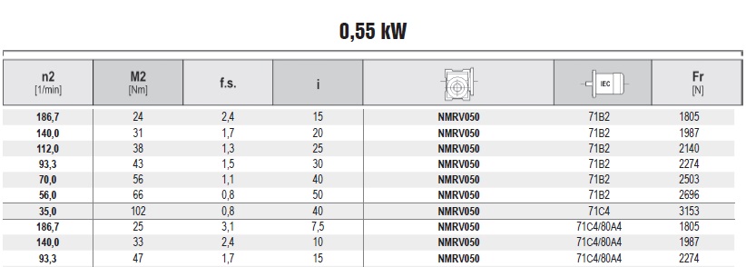 根據(jù)(表二)的數(shù)據(jù),后一排,速度93.3rpm,扭矩47nm;推薦的減速機為NMRV050-15的減速機,也能夠滿足負載的要求,區(qū)別在于050的減速機比040的減速機更大,使用系數(shù)fs為1.7,這樣的選型,減速機更安全,壽命更長。