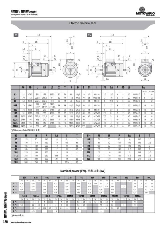第5項,是根據(jù)電機的法蘭確定的,對機座號為71的電機,國標有3種常用的安裝方式,分別是B3,B5,B14,B3是臥式安裝電機,和NMRV減速機沒法連接,B5和B14是兩種立式安裝的形式,電機的安裝法蘭面和電機的輸出軸垂直,都可以和NMRV減速機安裝,區(qū)別是B5的法蘭更大,B14的法蘭尺寸更小。以71機座的電機為例,B5的法蘭直徑為160mm,B14的法蘭直徑為105。我們選擇B14的法蘭,所以型號中的尺寸為105.對應的在采購電機時,也需要注明安裝法蘭為B14的安裝法蘭。