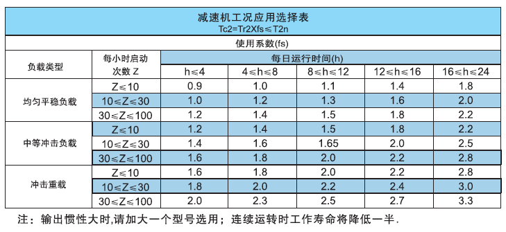 (4) 根據(jù)Tr2的值,和使用系數(shù)fs,計算在考慮實際使用狀況是的減速機扭矩:TC2,其中fs的選則見下表: