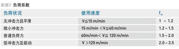 作用于直線導(dǎo)軌的負(fù)荷,除裝置本身自重、起動停止時的慣性負(fù)荷及因懸置而產(chǎn)生的力矩負(fù)荷外,還有因運(yùn)動伴隨而來的震動及沖擊負(fù)荷,此種型式的負(fù)荷并不容易算出,根據(jù)經(jīng)驗依負(fù)荷狀況及使用速度,建議將計算負(fù)荷值再乘以對應(yīng)的負(fù)荷系數(shù)。推薦如下表: