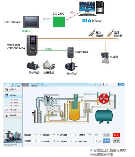 臺達(dá)解決方案整合了自有SCADA工業(yè)組態(tài)軟件DIAView系列、工業(yè)電腦、工業(yè)電源、4G無線模塊、人機(jī)界面、變頻器等。方案的創(chuàng)新在于實現(xiàn)了空壓機(jī)的智能化的控制,同時也可以將空壓機(jī)的控制信息納入工廠能源管理系統(tǒng)EMS的系統(tǒng)管控中。