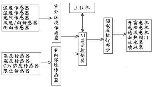 降濕:當(dāng)室內(nèi)濕度高于設(shè)定值時,控制開天窗、開通風(fēng),加強(qiáng)空氣對流,從而達(dá)到降低室內(nèi)濕度的目的。