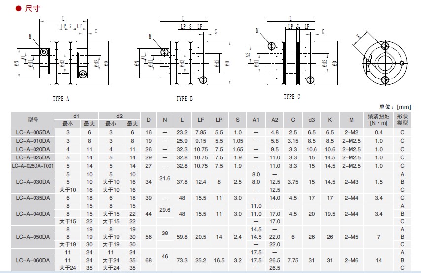 D. 確認(rèn)對軸向沒有壓縮和牽拉等作用力后,保證有效接觸長度,每個(gè)聯(lián)軸器的夾持長度克參考聯(lián)軸器的尺寸,要求大于2倍的C值,小于LF尺寸值。將2個(gè)夾緊螺栓鎖緊到所規(guī)定的扭矩。關(guān)于鎖緊扭矩請參照與相應(yīng)鎖緊扭矩一覽表。