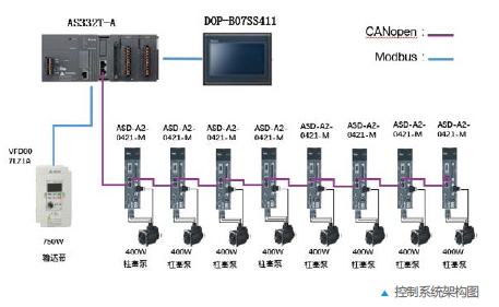 臺(tái)達(dá)直線灌裝設(shè)備控制解決方案主要采取可編程控制器(PLC)AS300系列加AS-FCOPM通訊功能卡、伺服驅(qū)動(dòng)器ASDA-A2系列通過CANopen總線,利用臺(tái)達(dá)專屬驅(qū)動(dòng)模式的便捷指令實(shí)現(xiàn)灌裝軸的精確控制。
