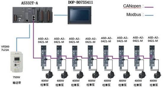 臺(tái)達(dá)直線灌裝設(shè)備控制解決方案主要采取可編程控制器(PLC)AS300系列加AS-FCOPM通訊功能卡、伺服驅(qū)動(dòng)器ASDA-A2系列通過(guò)CANopen總線,利用臺(tái)達(dá)專屬驅(qū)動(dòng)模式的便捷指令實(shí)現(xiàn)灌裝軸的精確控制。