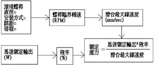 關(guān)于推力,型錄上的「額定推力」來(lái)自于螺桿轉(zhuǎn)速的限制,計(jì)算流程如圖3所示。其中滾珠螺桿的臨界轉(zhuǎn)速必須參照螺桿廠商的型錄計(jì)算,這個(gè)部份單軸機(jī)械手臂的使用者也是無(wú)法自行處理的。推力Fx算出來(lái)之后,就是滾珠螺桿的負(fù)荷,可以用來(lái)計(jì)算螺桿的壽命。就單軸機(jī)械手臂而言,水平安裝的一般操作條件下,重量負(fù)荷主要由線性滑軌承擔(dān),螺桿壽命比滑軌長(zhǎng)得多,通??梢圆槐乜紤]。
