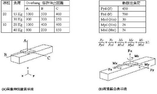 圖2(A)中,A、B、C三點(diǎn)的距離代表負(fù)荷作用點(diǎn)的位置向量的三個(gè)分量:上下(z)、前后(x)、左右(y),向量原點(diǎn)在滑臺(tái)安裝面的中心。這種表示法是以力矩的計(jì)算做基礎(chǔ),限制負(fù)荷在三個(gè)軸向的懸臂伸出量(overhang)。例如圖中,螺桿導(dǎo)程10時(shí),負(fù)荷20