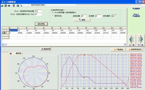 如果我們?cè)谏鲜鰴C(jī)構(gòu)中主動(dòng)軸電機(jī)上安裝一個(gè)編碼器,從動(dòng)軸也增加安裝一個(gè)光柵尺,然后再次運(yùn)行這個(gè)機(jī)械凸輪,并將剛才主動(dòng)軸轉(zhuǎn)動(dòng)角度和從動(dòng)軸上下位置一一記錄,并匯成一條數(shù)據(jù)表格,那么就可以利用軟件的方式來(lái)勾勒出一條曲線。這條用來(lái)描述主動(dòng)軸、從動(dòng)軸位置關(guān)系的軟件曲線就是電子凸輪曲線。